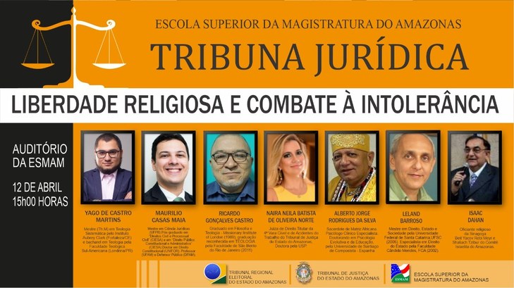 Dia 12 de abril de 2022, Terça-feira, às 15h, no Auditório Desembargador Arthur Virgílio do Carmo Ribeiro, 2º andar do Centro Administrativo Desembargador José de Jesus Ferreira Lopes, anexo ao Tribunal de Justiça e através do Ambiente Virtual de Aprendizagem – AVA (Exclusivo para os inscritos), acontecerá a Tribuna Jurídica “Liberdade religiosa e combate à intolerância”. O evento está sendo realizado pela Escola Superior da Magistratura do Amazonas – ESMAM, em parceria com a Escola Judiciária Eleitoral do TRE-AM, a partir de Termo de cooperação celebrado entre as instituições.