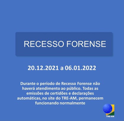 Durante o período de Recesso Forense não haverá atendimento ao público. Todas as emissões de certidões e declarações automáticas, no site do TRE-AM, permanecem funcionando normalmente.